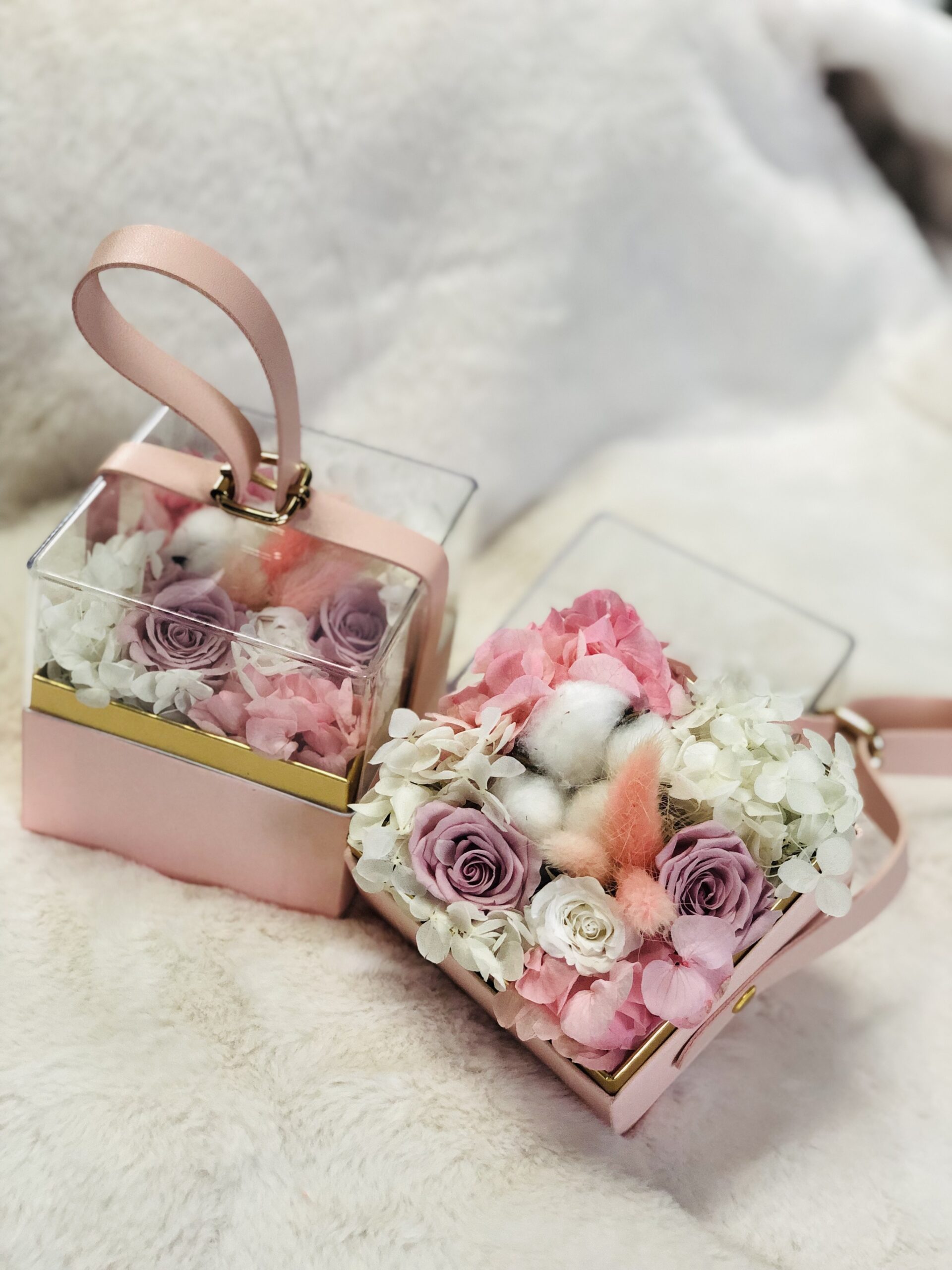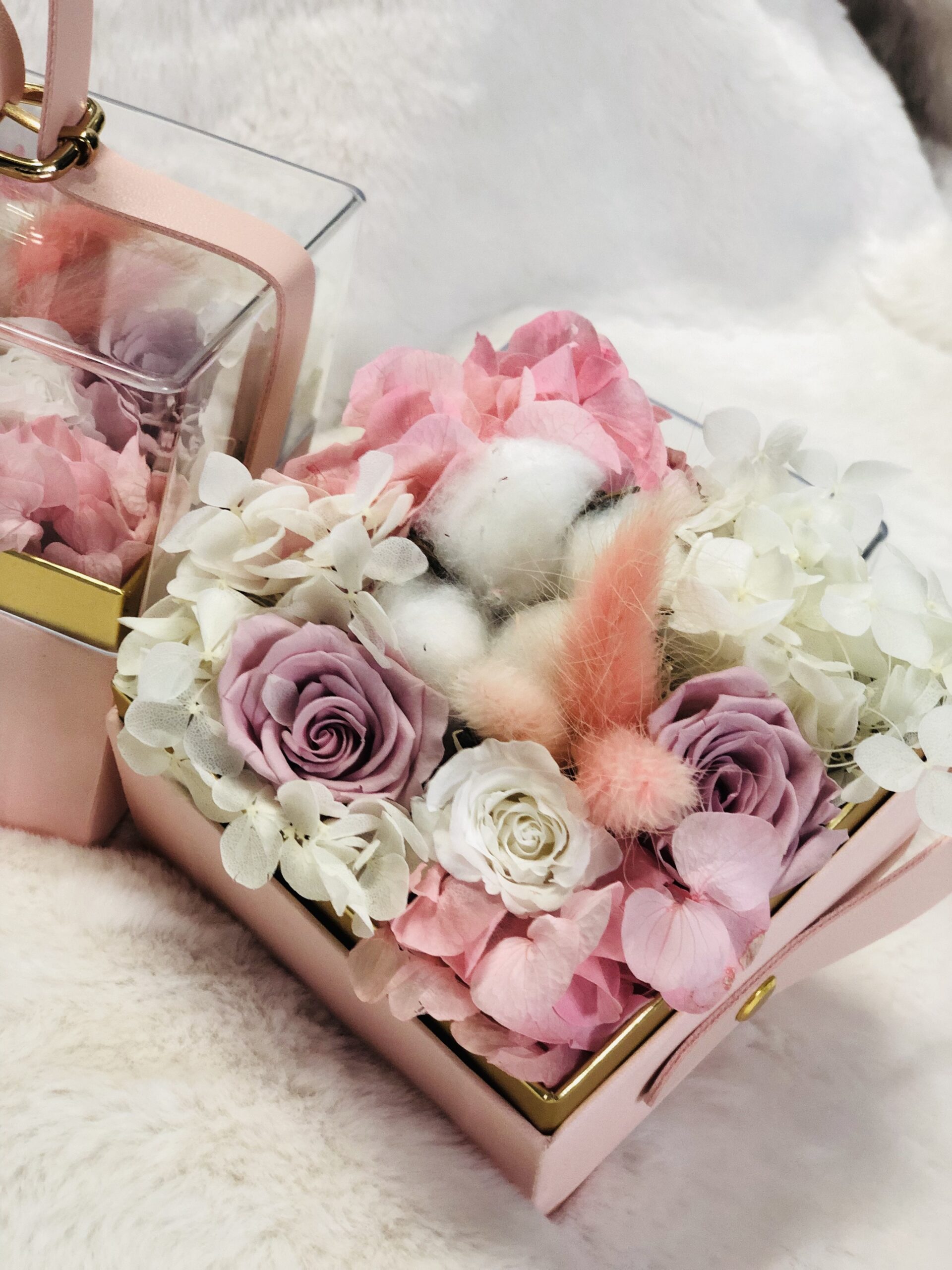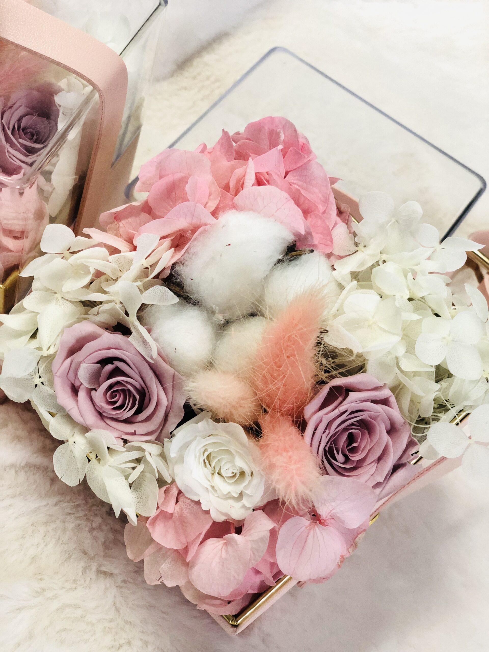 Zauberhafte Blumenbox mit konservierten Rosen, Hortensien-Rispen, Lagurus und Baumwollblüte.